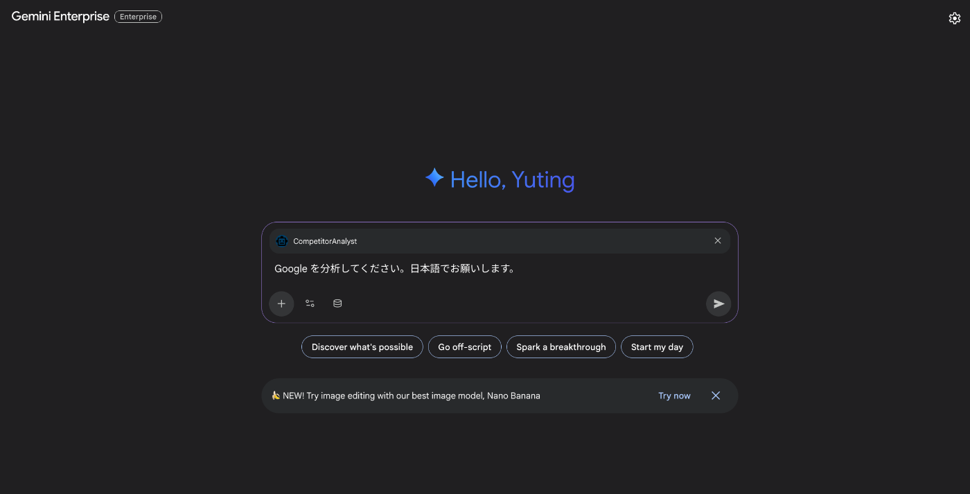登録が完了すると、社員が普段使っている Gemini Enterprise の Agent Gallery 画面に、今回作った「競合調査エージェント」が登場します。