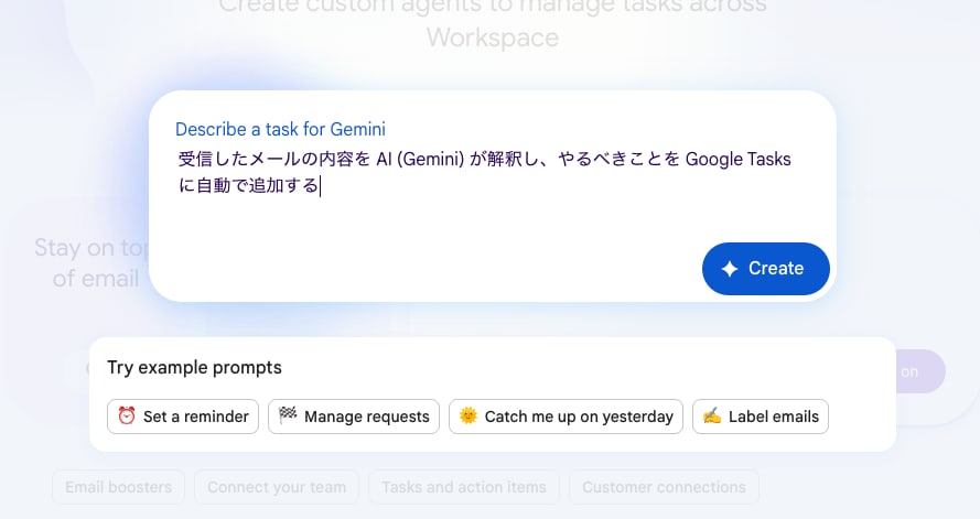 [Describe a task for Gemini] に「受信したメールの内容を AI (Gemini) が解釈し、やるべきことを Google Tasks に自動で追加する」と入力し [Create] をクリックします。