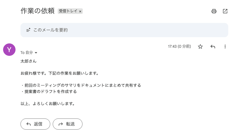 たったこれだけの設定で メールを受信する → Gemini が内容を読んでタスク化 → Google Tasks に自動で追加される という流れが完成します。これで、大事な依頼の見落としがなくなりますね。