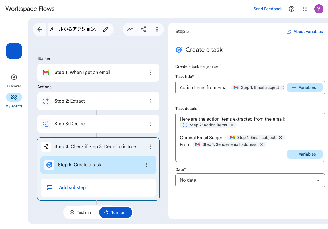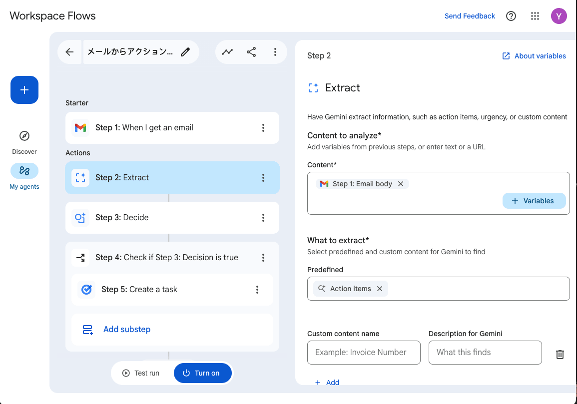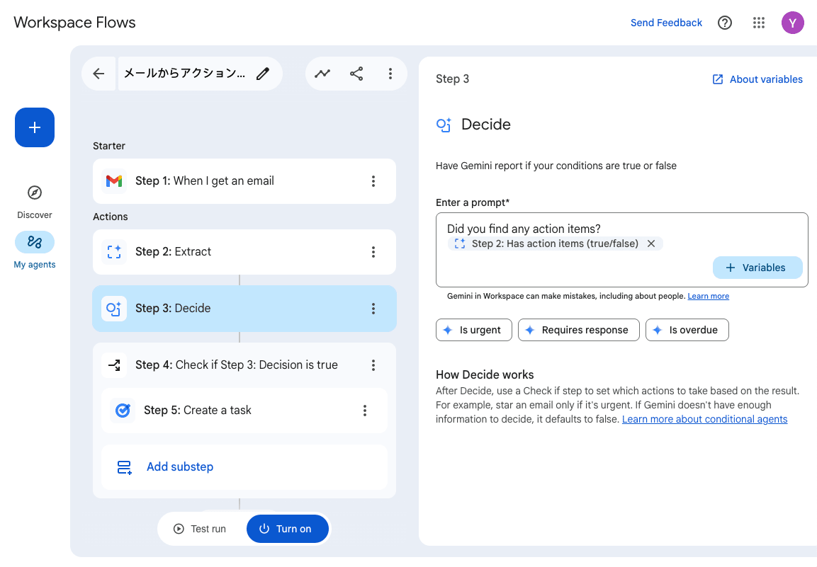 Step 3 は Deside、つまり判断を Gemini にさせています。Step 2 を参照し、この中にアクションアイテムがあるかどうかを確認しています。