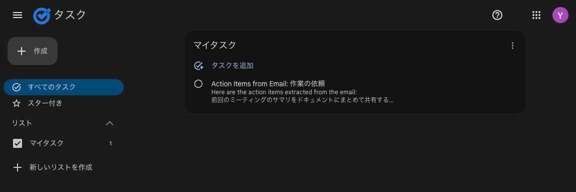 Google Tasks を開いてみると、実際にタスクが作成されていることが確認できました。