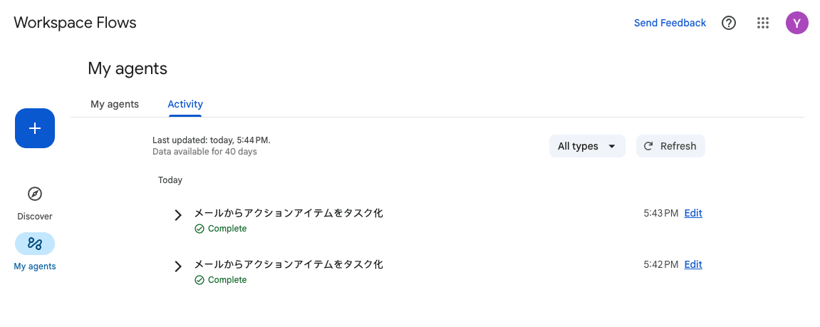 メール受信後、Workspace Flows の Activity を見てみると Flow が実行されていることが確認できます。設定に不備などなければ [Complete] となるはずです。
