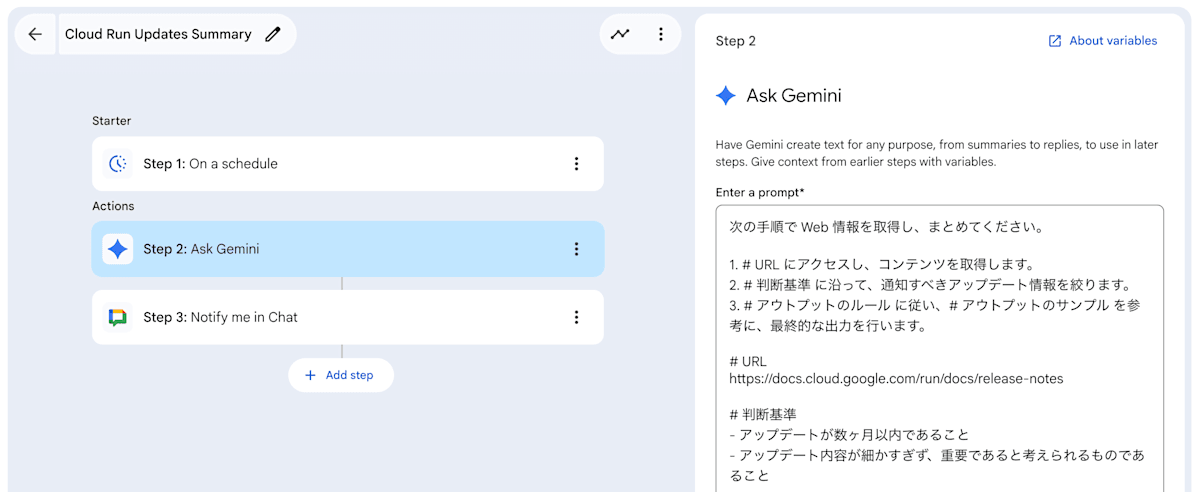 Step 2 は [Ask Gemini] を設定します。URL からリリースノートのコンテンツを取得し、重要なアップデートにサマリするプロンプトを設定します。