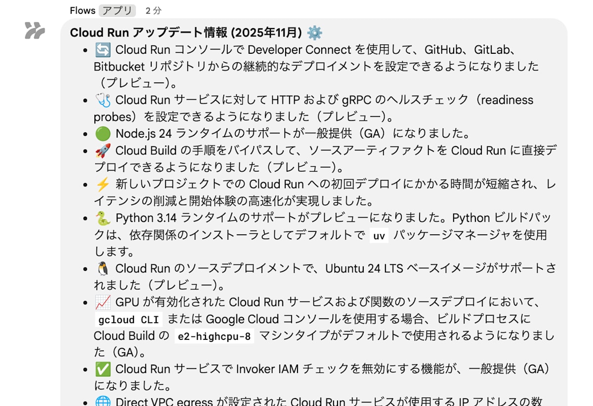 この記事では、Google Workspace Studio を使って Cloud Run の重要なアップデートを自動で通知するフローを作成しました。[Ask Gemini] アクションを活用することで、リリースノートの URL から情報を自動で取得し、重要な更新だけを要約して Google Chat で通知を受け取ることができます。