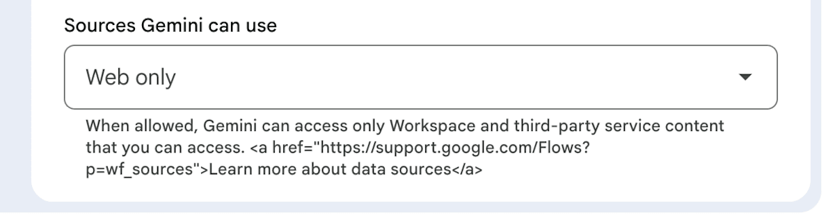 また [Sources Gemini can use] は [Web only] にします。Workspace の内容も含めるようにしてしまうと、Drive に保存された情報などを参照しハルシネーションを起こしてしまう可能性があります。