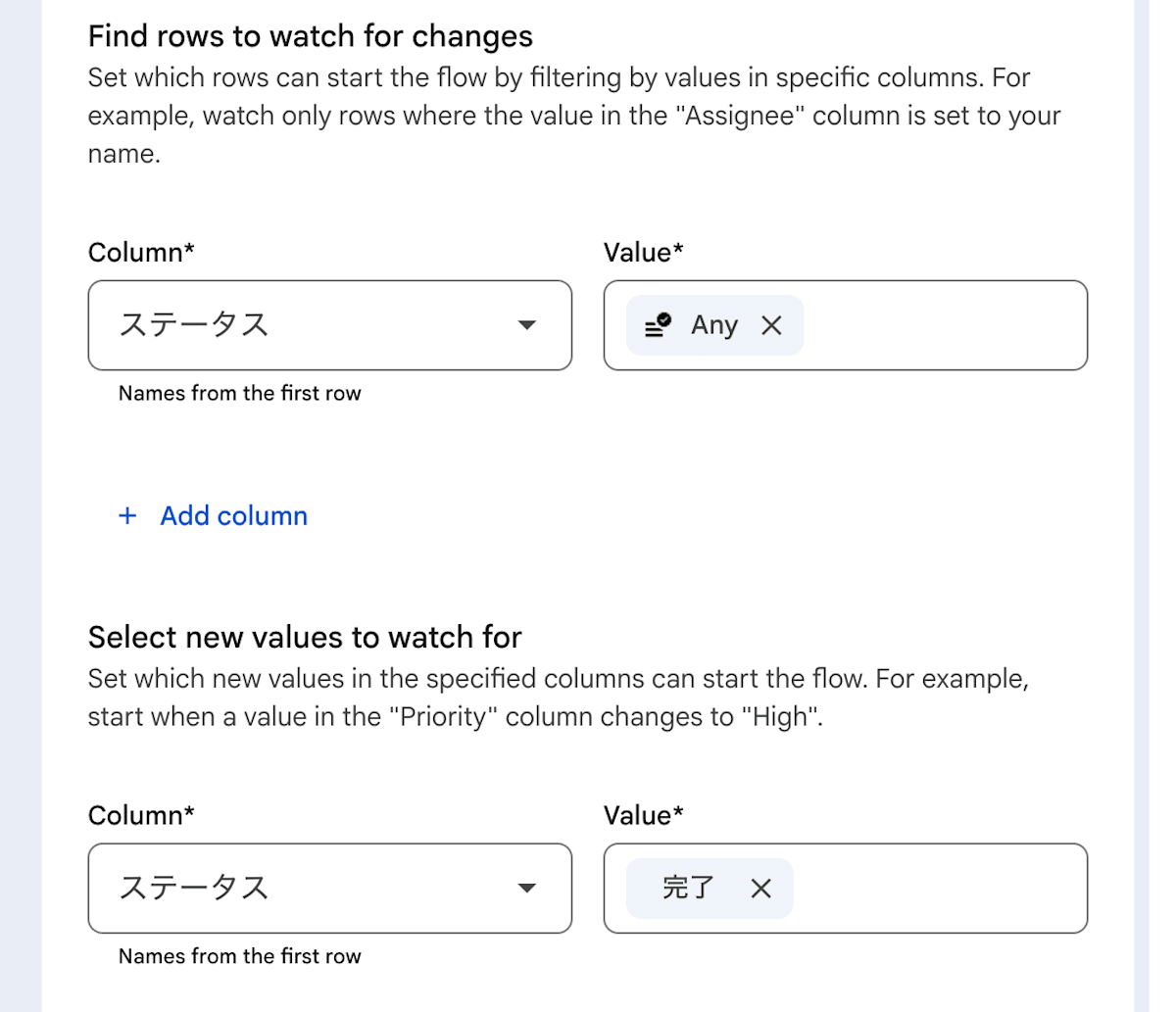 [Find rows to watch for changes] はどのカラムの値を監視するかを設定します。ステータスが追加・変更されたことをチェックしたいので [Column] には [ステータス] を、[Value] には [Any] を指定します。