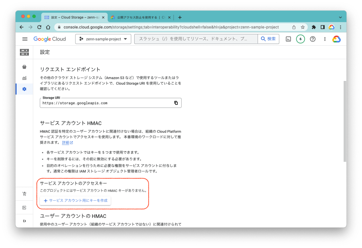 - あとでWinSCPに設定するのでリクエストエンドポイントの「storage.googleapis.com」を覚えておきつつ、「サービスアカウントHMAC」のセクションにある「+サービスアカウント用にキーを作成」ボタンをクリックします。