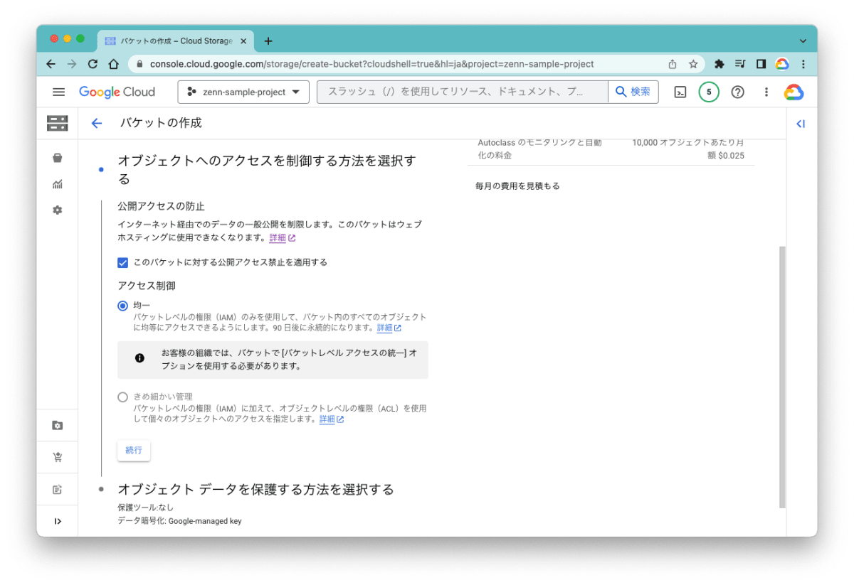 - バケット内のオブジェクトへのアクセスを制御する方法を選択します。アクセス制御には「均一」(Uniform)と「きめ細かい管理」(Fine-grained)の2つがあります。「推奨されるバケット アーキテクチャ」にもあるように、異なるアクセス権のオブジェクトを1つのバケットに混ぜるのは推奨されないので、通常は「均一」(Uniform)の方を選んでおくとよいでしょう。なお、デフォルトで公開アクセスを防止するために「このバケットに対する公開アクセス禁止を適用する」にチェックが入っています。公開する予定がなければそのままにしておきましょう。