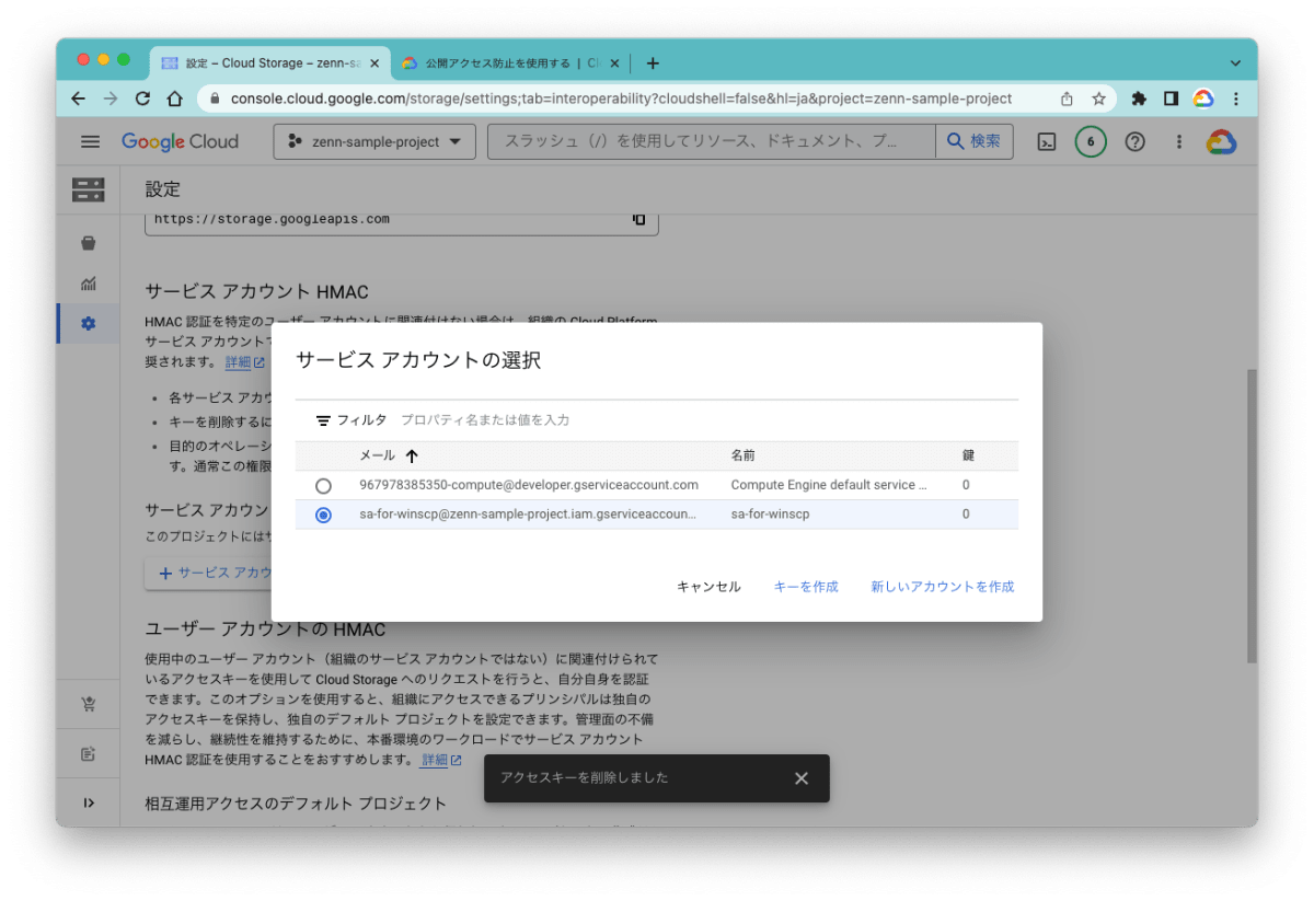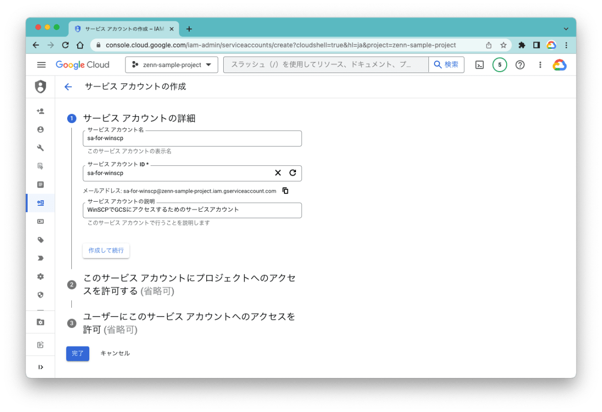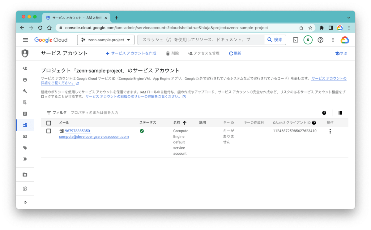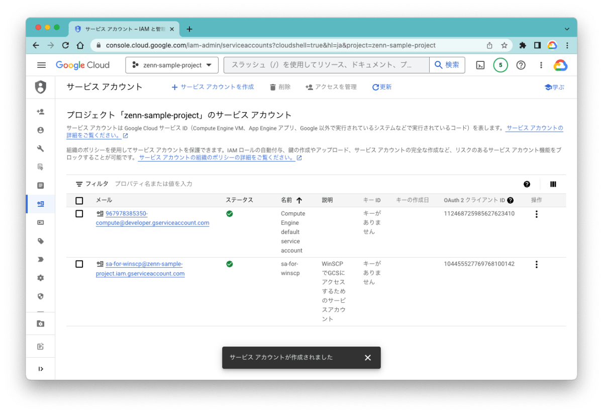 サービスアカウント「sa-for-winscp@zenn-sample-project.iam.gserviceaccount.com」ができました。