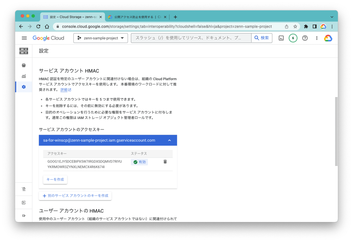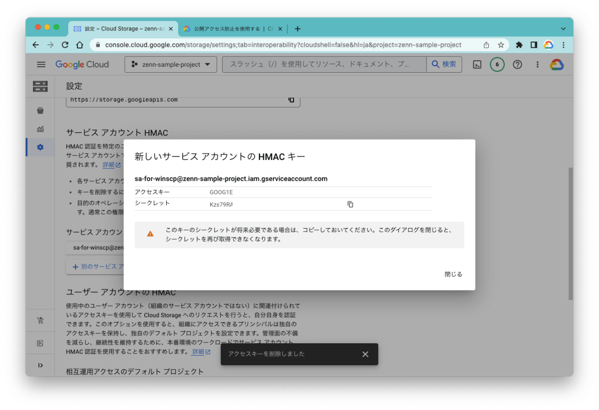 $ gsutil hmac create sa-for-winscp@zenn-sample-project.iam.gserviceaccount.com