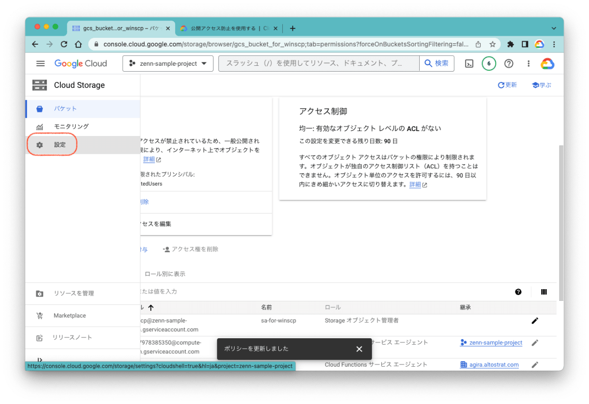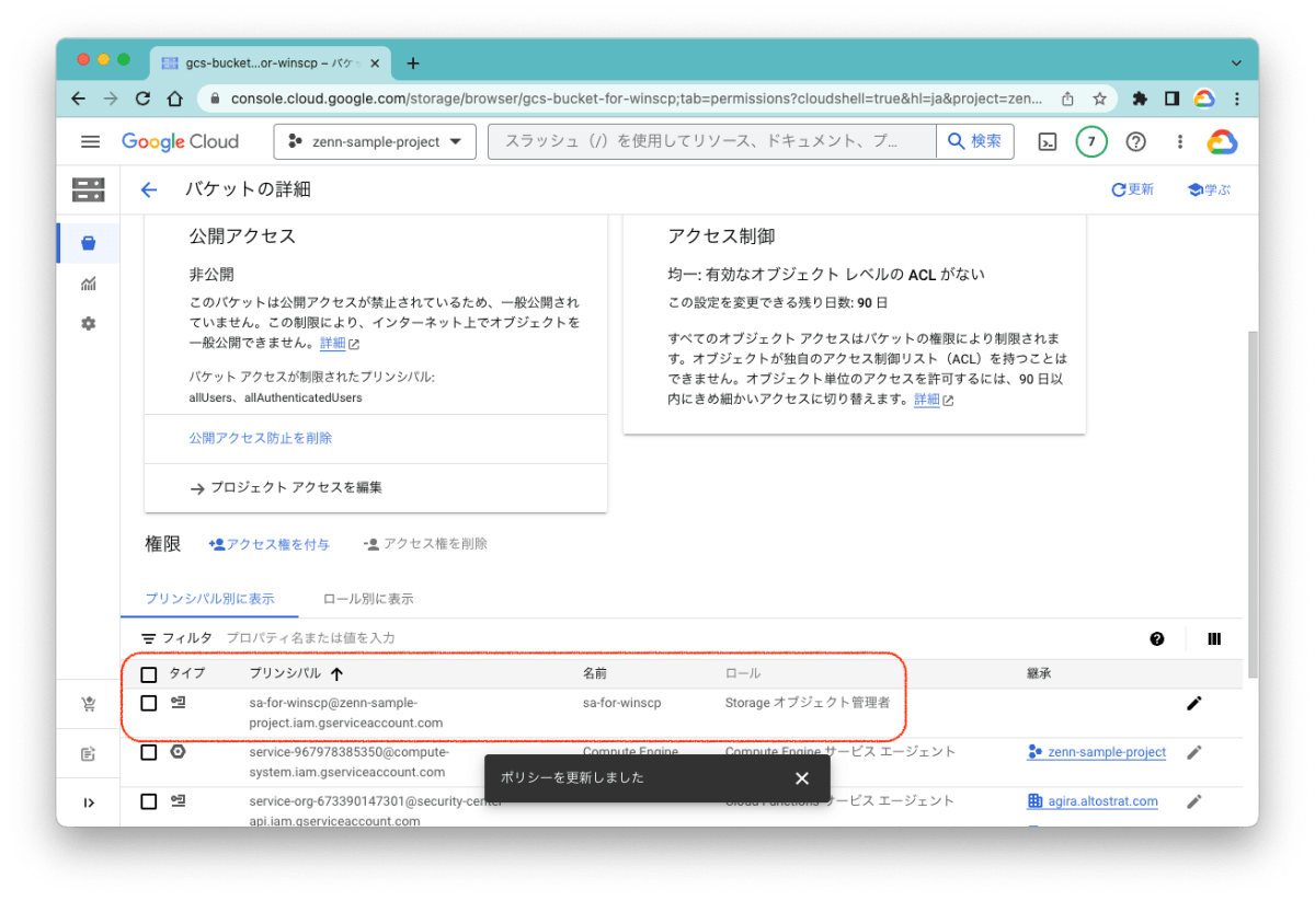 バケットができたので、先に作ったサービスアカウント「sa-for-winscp@zenn-sample-project.iam.gserviceaccount.com」にバケットへのアクセス権を付与します。