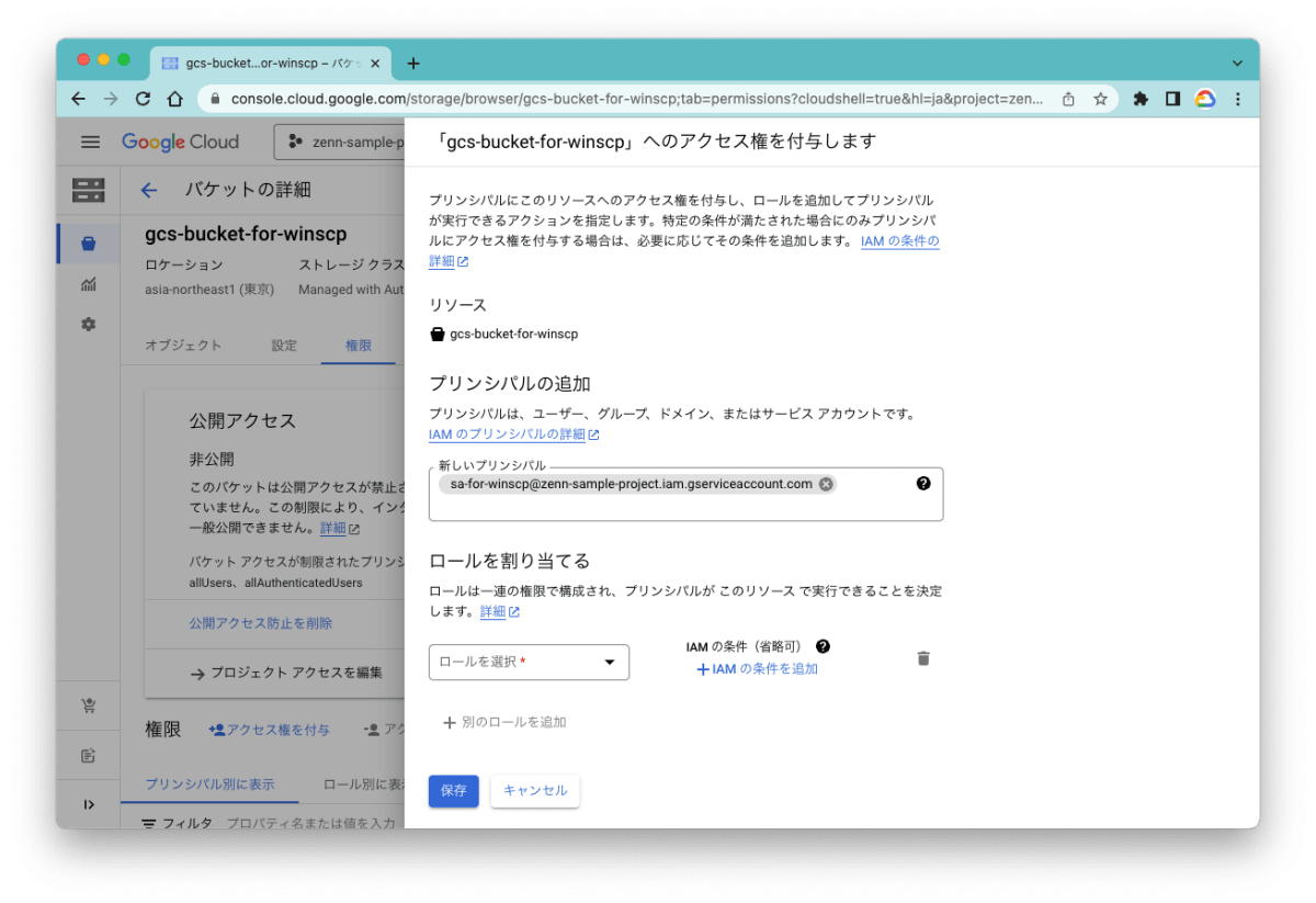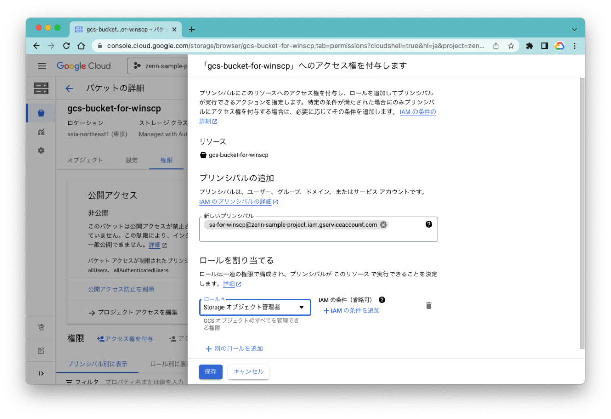 無事、サービスアカウント「sa-for-winscp@zenn-sample-project.iam.gserviceaccount.com」にバケット「gcs-bucket-for-winscp」でのロール「Storageオブジェクト管理者」を付与することができました。