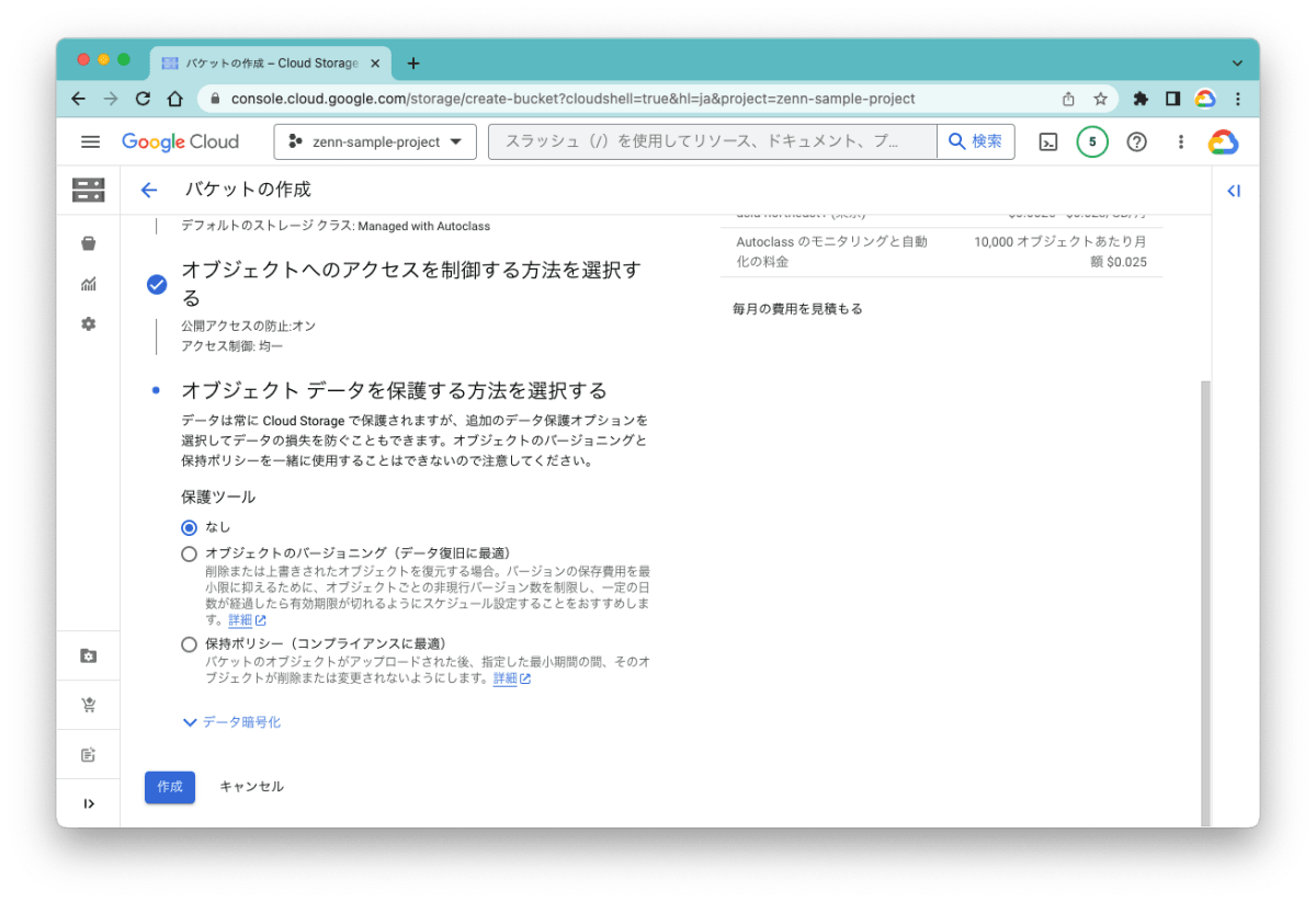 - 最後にバケット内のオブジェクトを保護する方法を選択します。この場合の「保護」は誤ってオブジェクトを削除してしまわないようにする、といった意味合いでの保護になります。方法としては「オブジェクトのバージョニング」と「保持ポリシー」があります。バージョニングではオブジェクトの更新時に指定された分だけバージョンを保持し、保持ポリシーでは指定した期間オブジェクトを削除・置き換えできなくなります。また、オブジェクトの暗号化もここで指定できます。今回はテストなので「なし」を指定します。