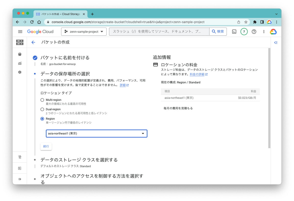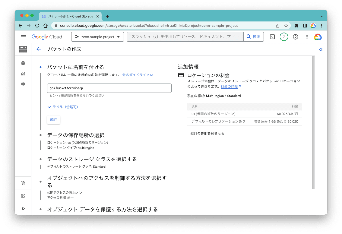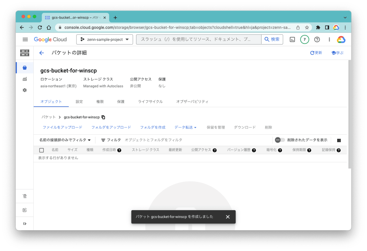 - 以上でGCSのバケット「gcs-bucket-for-winscp」が作成できました。