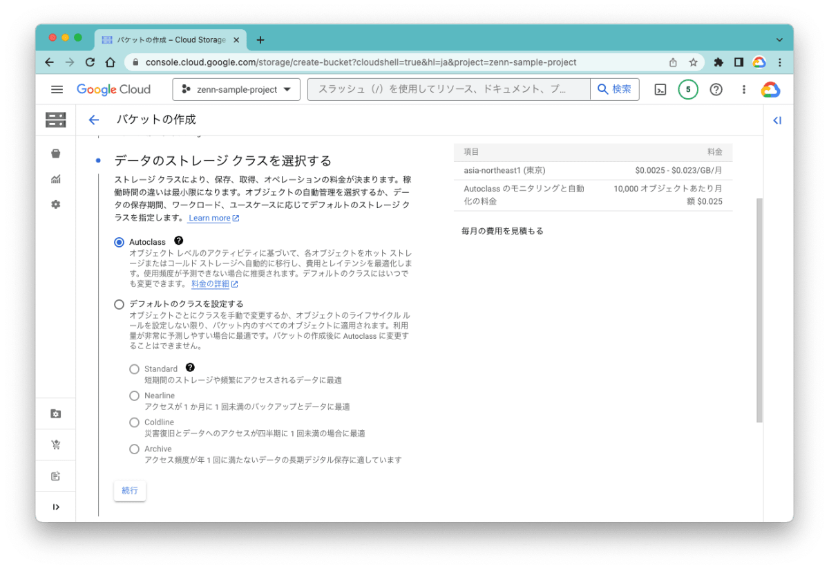 - データのストレージクラスを選択します。バケットに保存するオブジェクトがどんな使われ方をするか分からない場合は「Autoclass」を選んでおくと楽です。「Autoclass」については「Cloud Storageの新機能Autoclassについて」という記事が詳しいです。