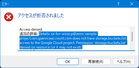 実はWinSCPはデフォルトでは接続後にバケットの一覧を表示しようとする(storage.buckets.list)のですが、今回設定した「ストレージオブジェクト管理者」は(その名の通り)オブジェクトの管理者なので、バケットを一覧する権限がなく、エラーになっています。