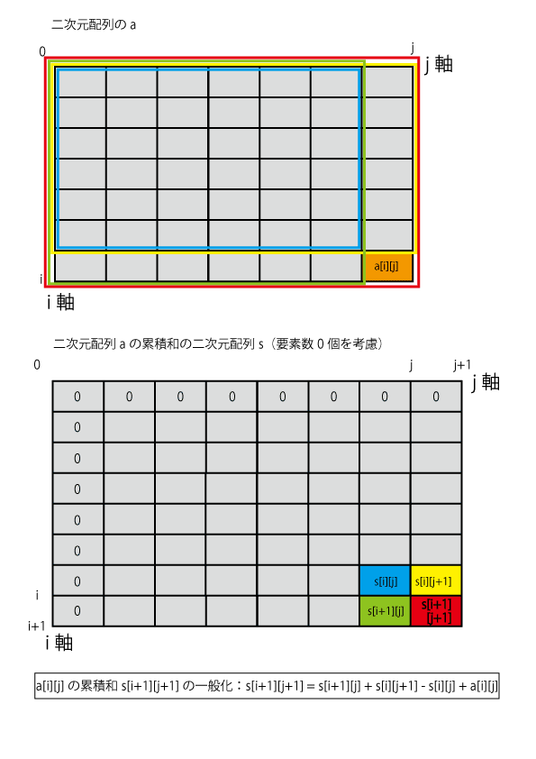 aの累積和の二次元配列sの一般化は、下記の通りとなります。s[i + 1][j + 1] = s[i + 1][j] + s[i][j + 1] - s[i][j] + a[i][j]- 具体例として、二次元配列