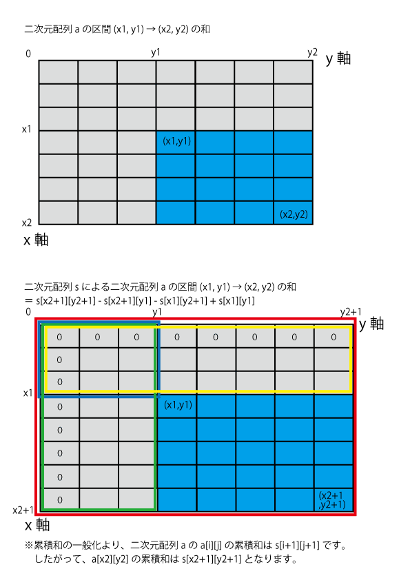 aの区間(x1, y1)→(x2, y2)の和を二次元配列sを使って一般化すると、下記の通りとなります。s[x2 + 1][y2 + 1] - s[x2 + 1][y1] - s[x1][y2 + 1] + s[x1][y1]- 具体例として、二次元配列