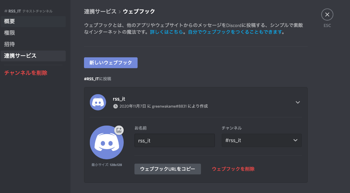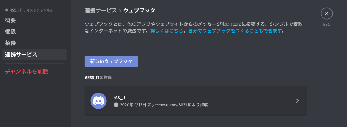 Discord Webhook URL作成