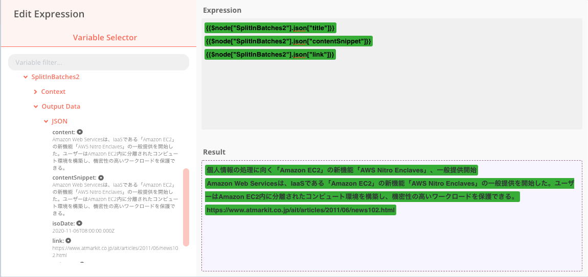 SplitlnBatchs → OutPut Data → JSON 出力したい項目を選択