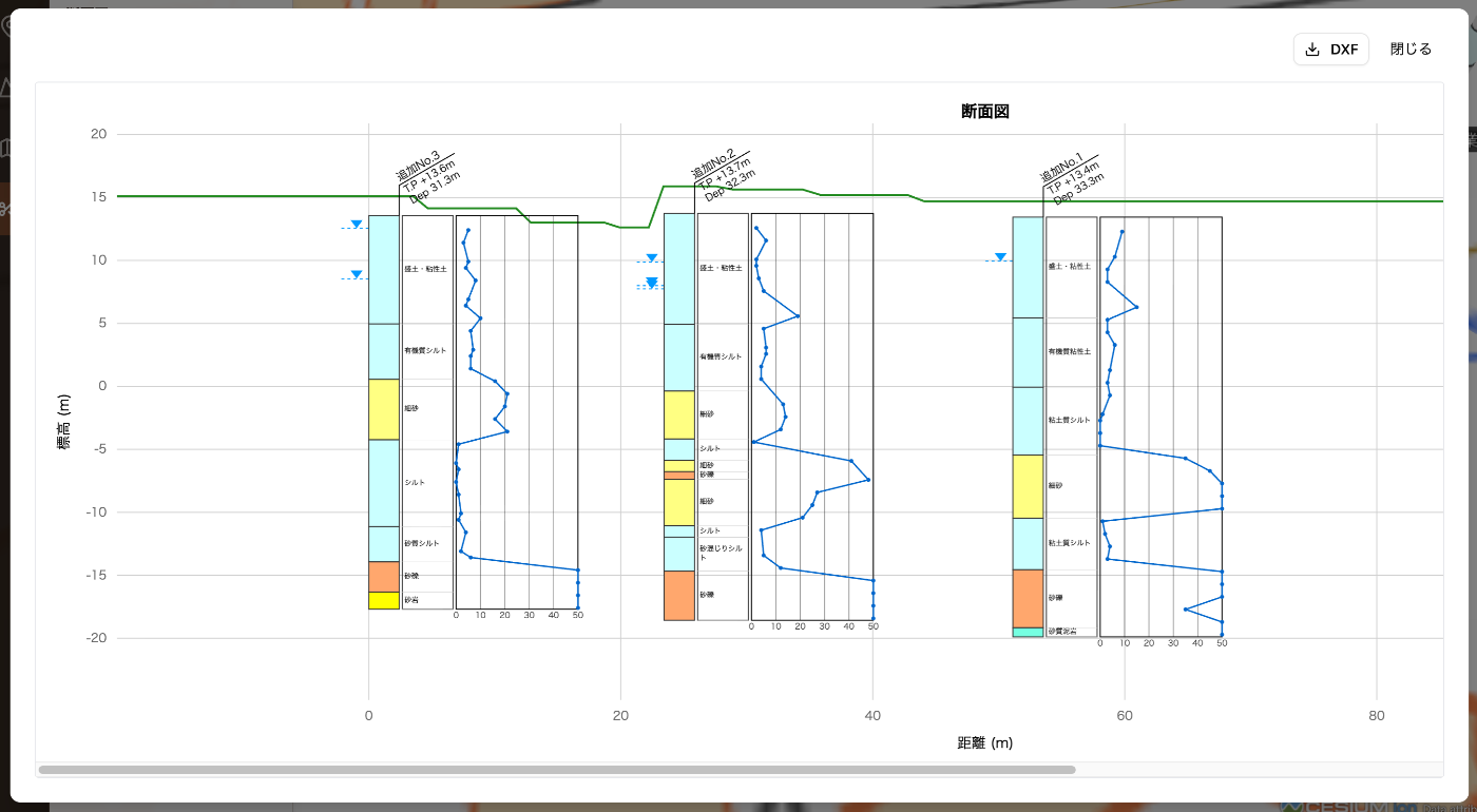内部的には、選択されたボーリング間の距離を計算し、直交座標系(X: 水平距離、Y: 標高)でデータを保持しています。このため、Canvas描画もDXF出力も同じ座標データをそのまま使えます。