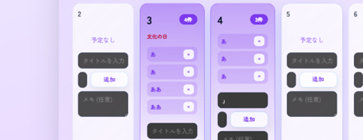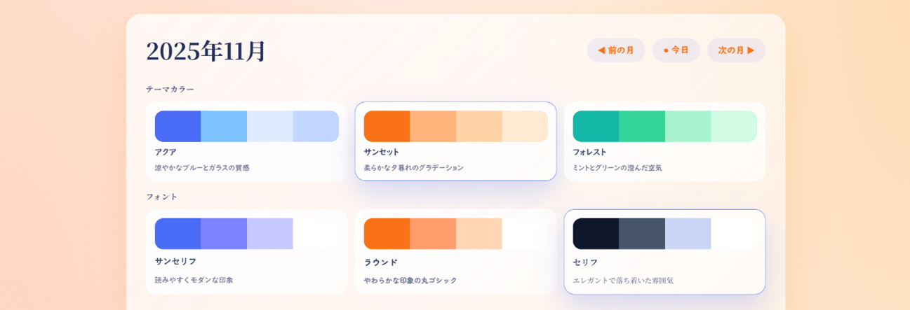 私が作成したカレンダーでは、テーマカラーやフォントの選択機能、予定を入れると日付セルの色が濃くなる仕組み、そしてクリックせずに直接文字を書き込める仕様を組み込みました。
