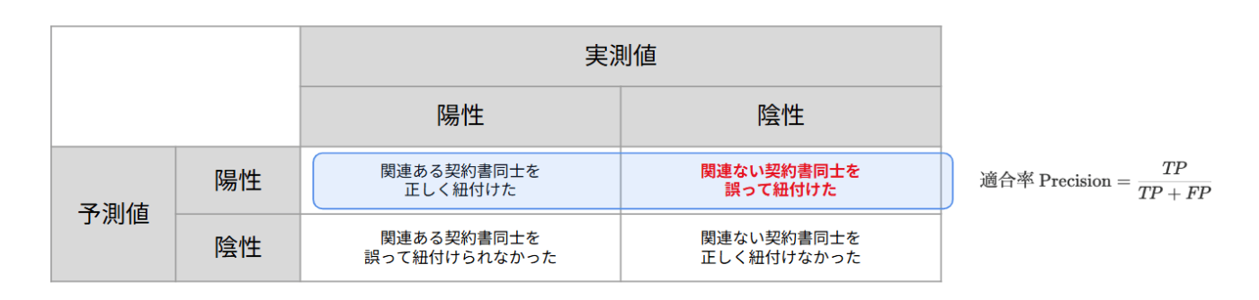 関連のない契約書間が誤って紐づいてしまう偽陽性の発生が、利用者の不満に繋がってしまうと考え、適合率を重視する方向で協働した他チームのメンバーに精度測定いただきました。