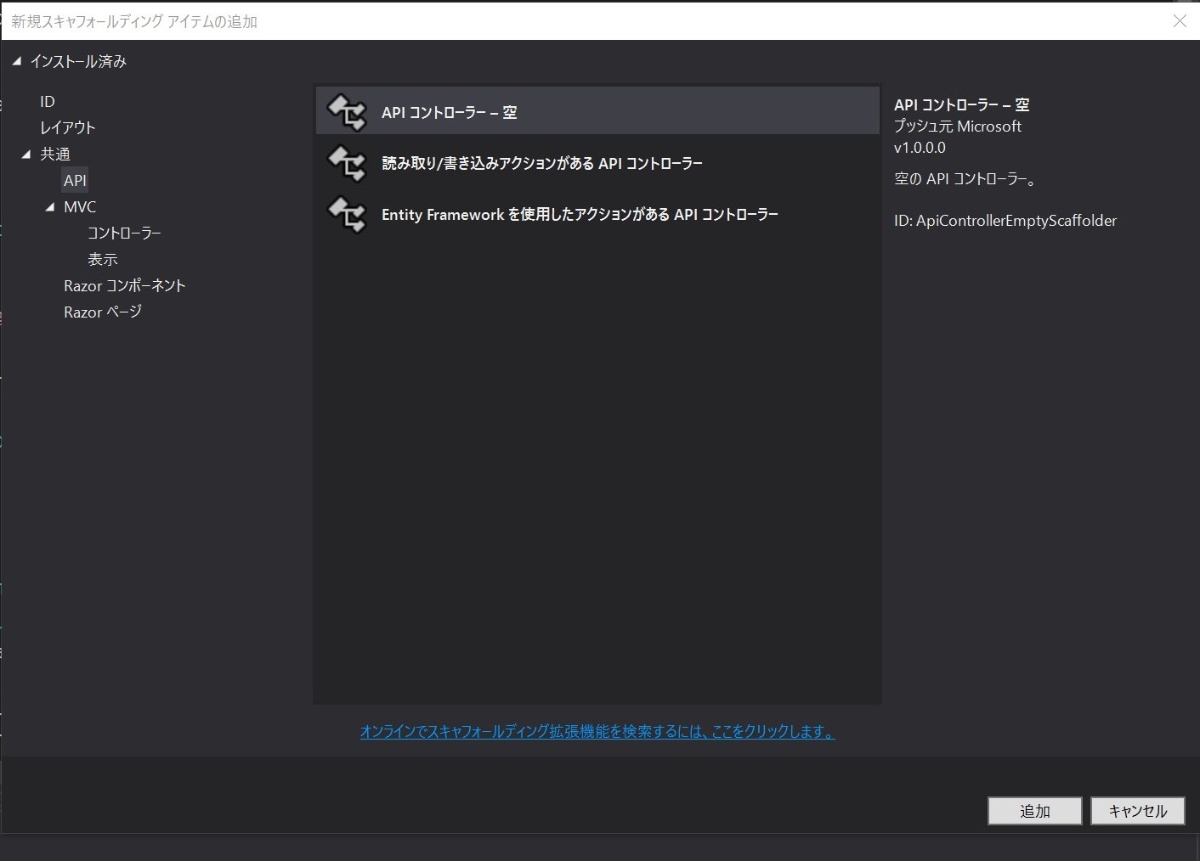 「コントローラ」もしくは「新しい項目」をクリックしてAPIコントローラを追加すると作成できます