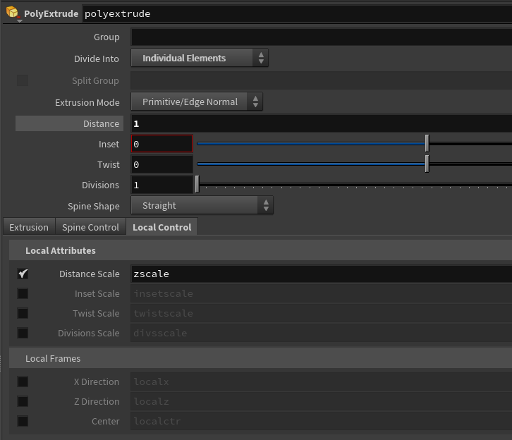 LocalControlによって振幅の高さ(DistanceScaleのzscale)をAttributeから取得しています。(zscaleは前述にWrangleノードで作成しました。)