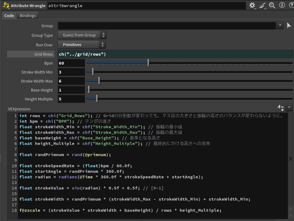パラメータとロジックの大半はVEXで書いています。