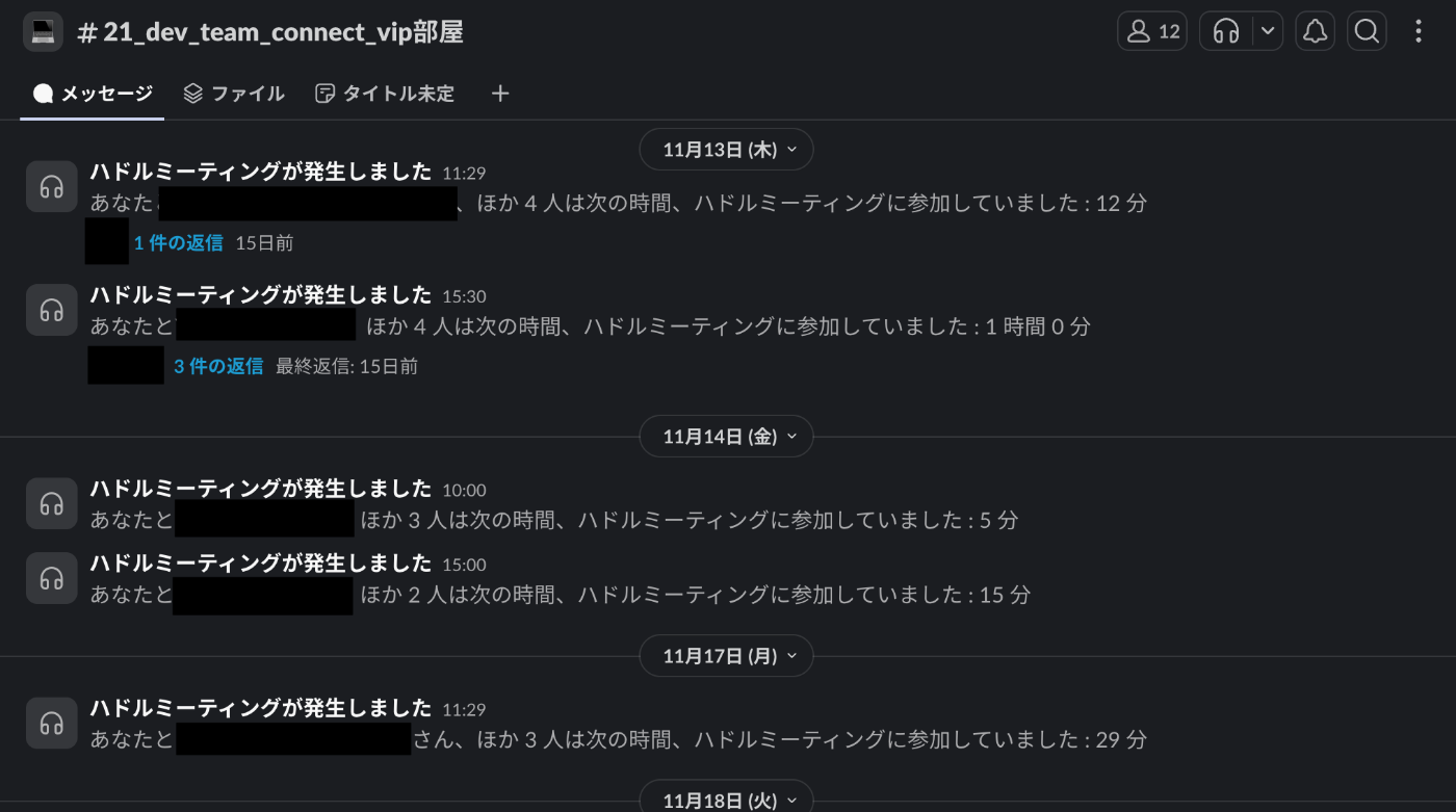 Huddleを開始すると、必ず「ハドルミーティングが発生しました」という通知がチャンネルに投稿されます。ミーティングのたびにこの通知が流れるため、重要なメッセージが埋もれてしまい、見逃しが発生していました。