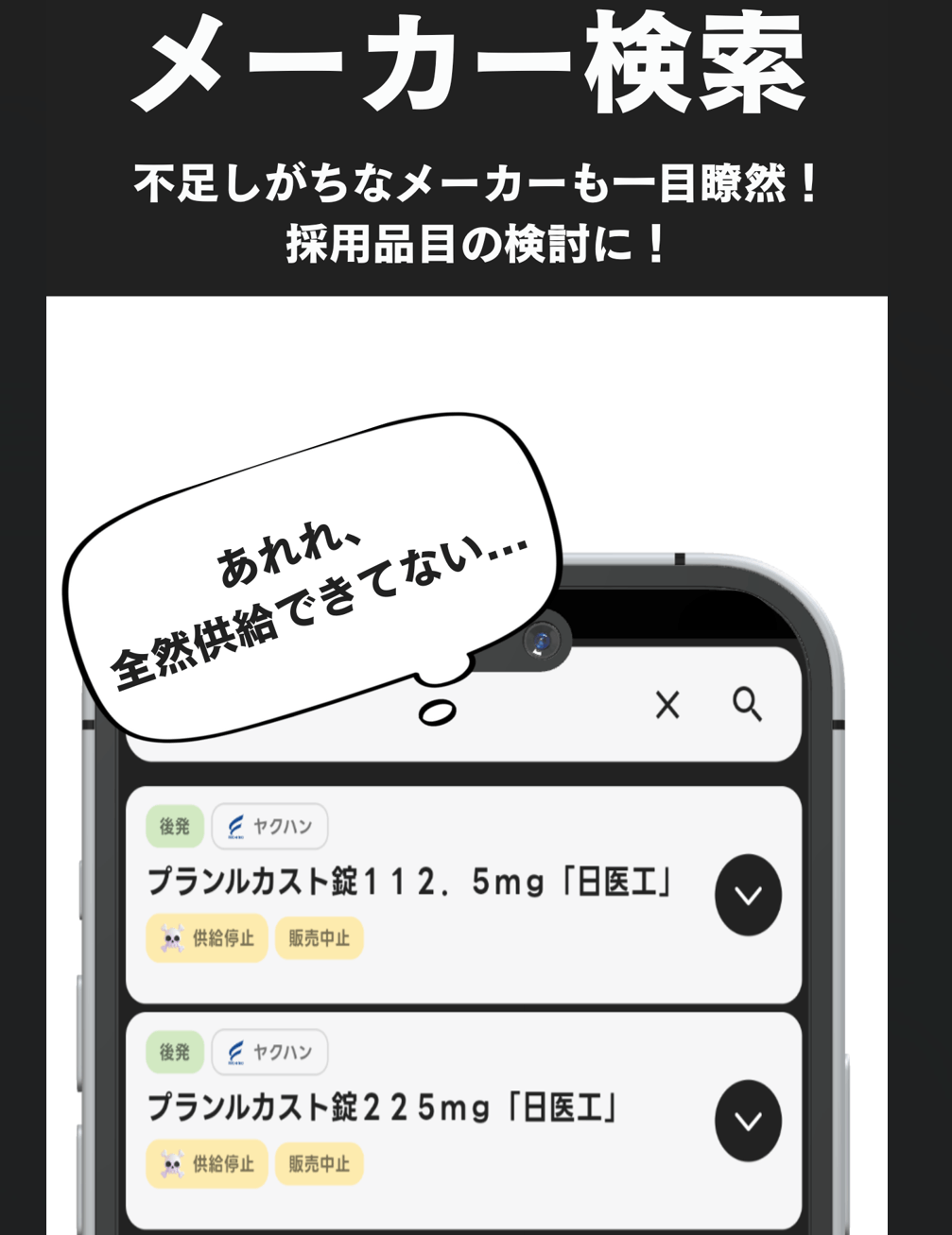 素早く薬をそろえ、なるべく継続的に採用し続けられるメーカーの選定に、役立ててください。