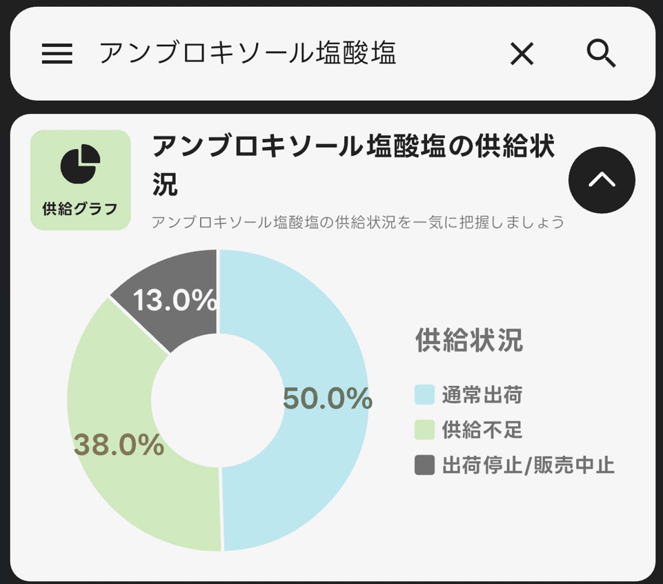 たとえば、上記画像の薬は痰を切る薬ですが、通常供給しているメーカーは半数しか存在せず、それ以外が供給不足 or 出荷停止となっていることがわかります。