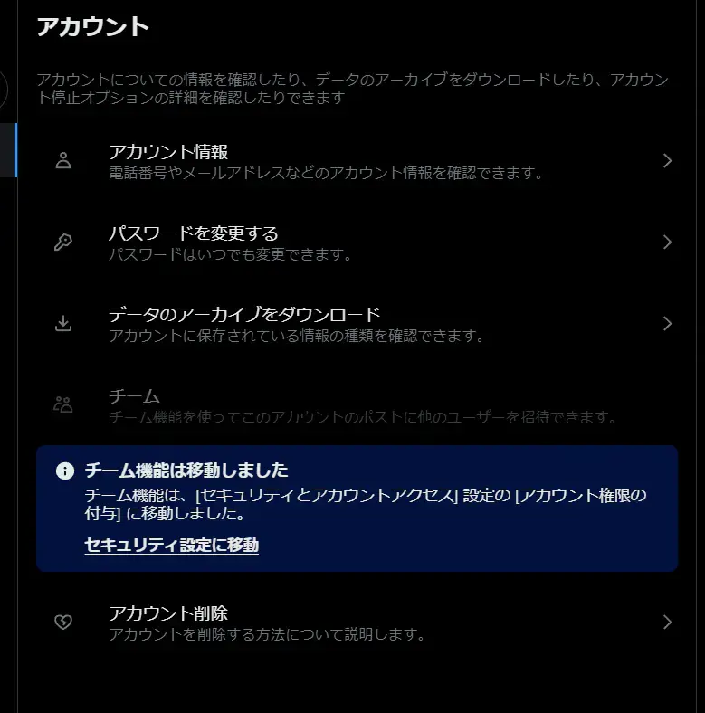 まずはXの設定 -> アカウントから「データのアーカイブをダウンロード」を選択して、アーカイブ依頼を出します。