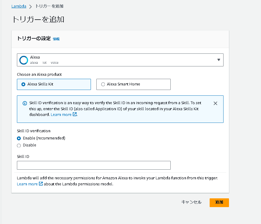 AlexaスキルからLambdaを呼ぶためにはトリガーを設定する必要があります。