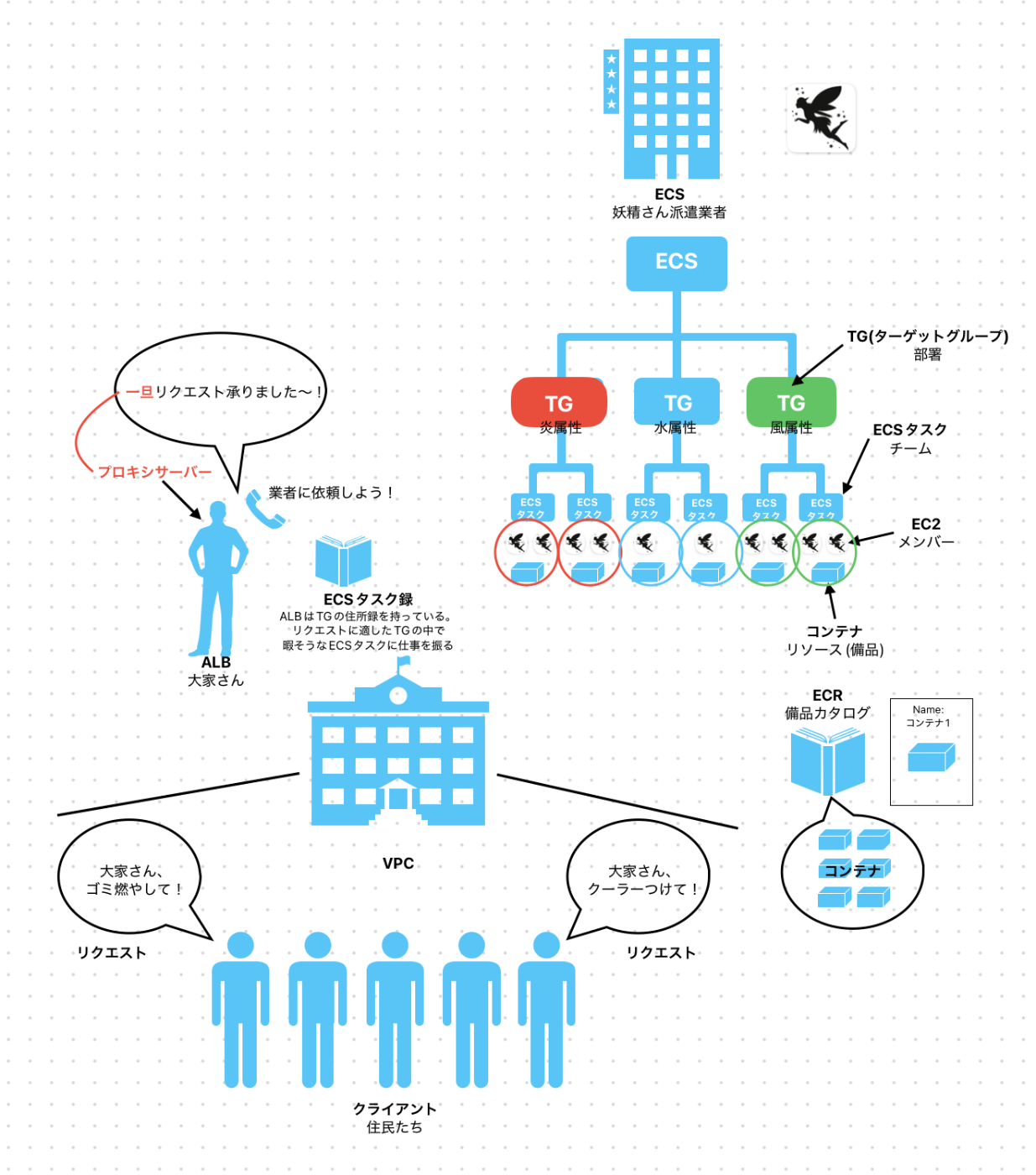 一度、クライアントからリクエストを聞き入れるプロキシサーバー(代理サーバー)の役割を担うとともに以下のような手順で、効率よく作業を割り振る装置(Application Load Balancer)。今回の例で言えば大家さん。この大家さんは妖精さん派遣業者その名もECSの各チームの位置情報が入った住所録のようなものを所持しており、選択した部署の中から暇そうなチームを選択して作業を依頼する。