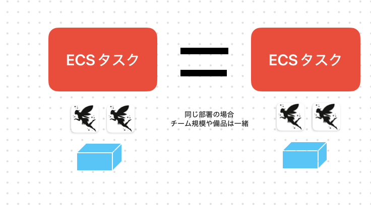 TGの配下に置かれており、実際に作業を行うEC2やコンテナなどが含まれている。例で言えば、各部署に設置されているチームである。このチーム単位で作業が行われる。また、同じTGのなかに設置されたECSタスクであれば、そこに配属されているEC2やコンテナなどの数、機能、規模全て同質である。
