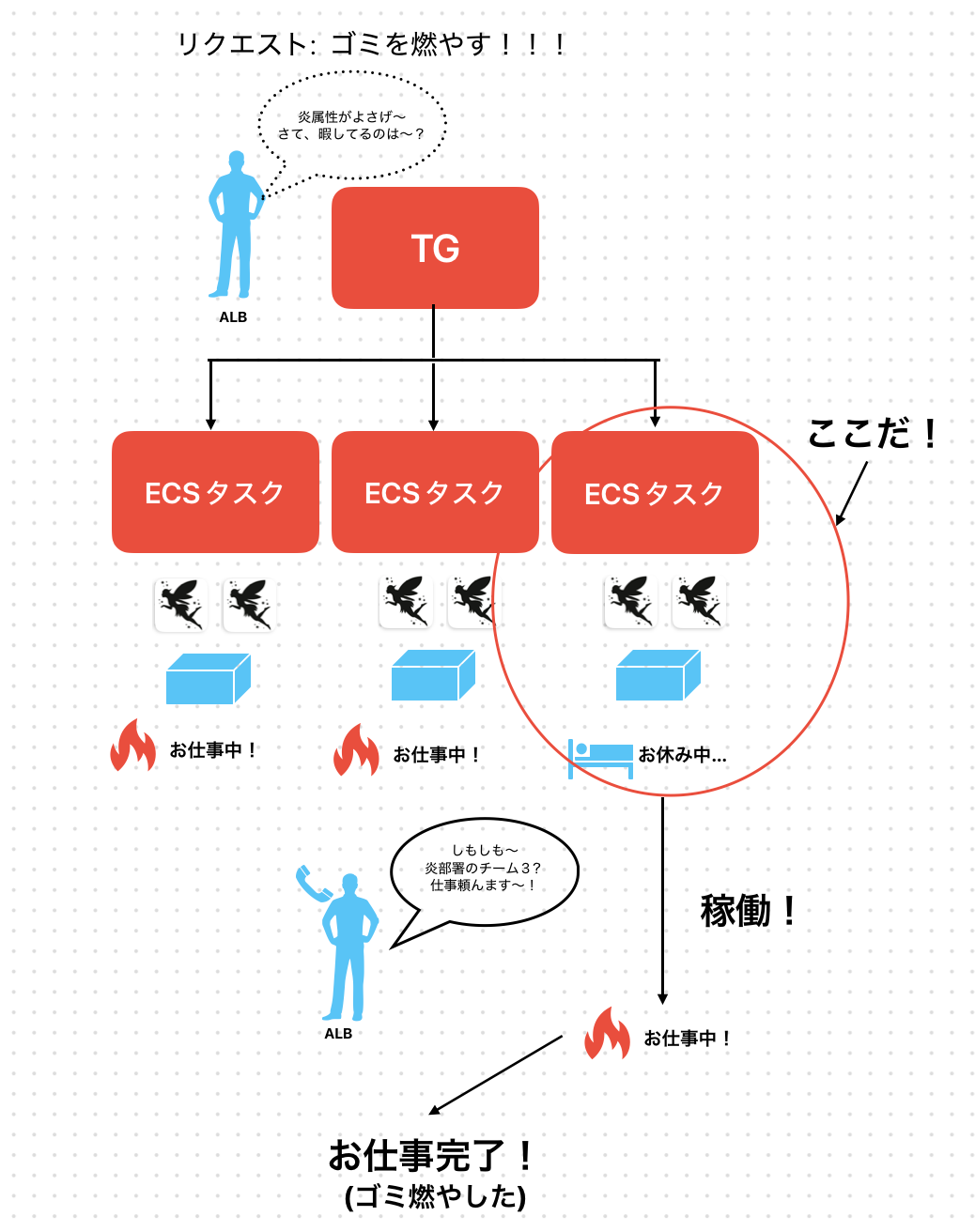 - ALBはさらにそのTGの中で稼働中でないECSタスクを選択する