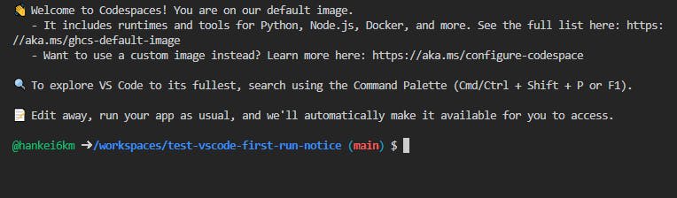 @hankei6km ➜ /workspaces/test-vscode-first-run-notice (main ✗) $ ./gen-notice.sh > .devcontainer/first-run-notice.txt