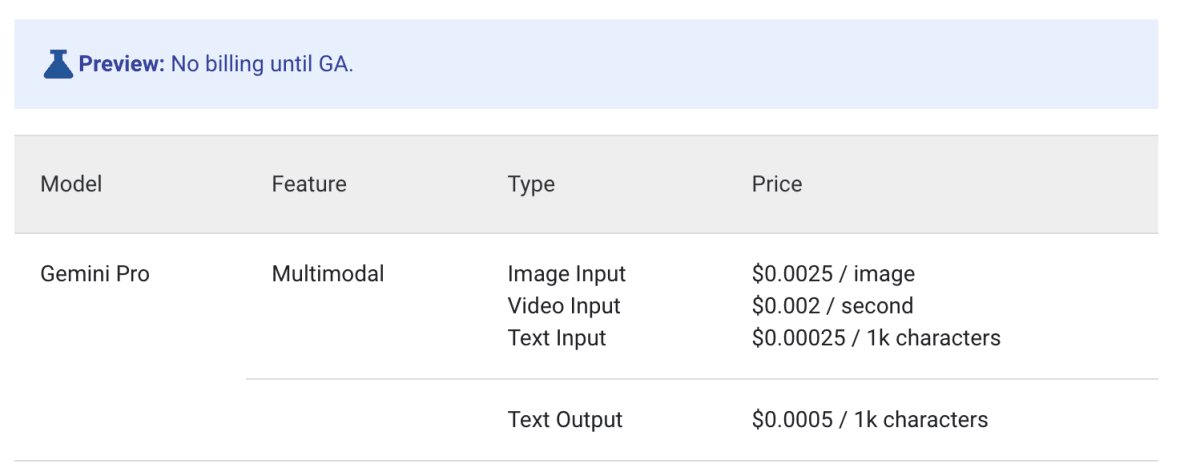 PaLM2と同様に1000文字ごとの課金体系になっています。また、Text Inputに関しては、PaLM2(Text Bison)と同様の金額です。