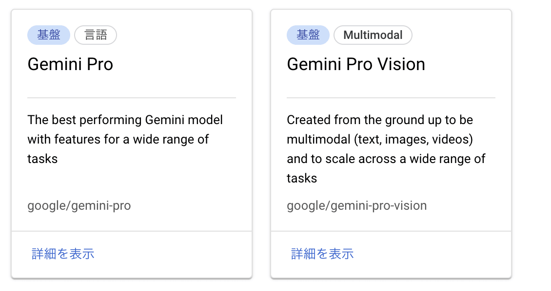 Vertex AI Gemini APIで提供されているGemini Proでは、用途に合わせた2種類のモデルが提供されています。テキストのみを扱うのか、もしくは画像や動画も追加で扱うかによって選択するモデルが異なります。ともに、東京リージョンで利用可能です。