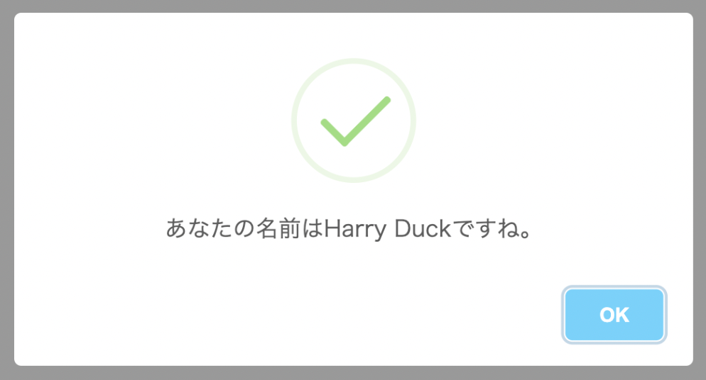 前述の通り、SweetAlert2のドキュメントがそのまま使えるわけではないですが、