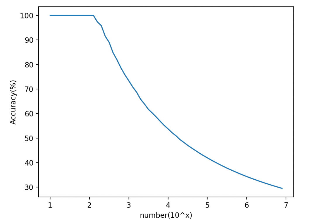 グロタンディーク素数っぽい数がどのぐらい素数なのかの正答率(Accuracy)をプロットしてみた