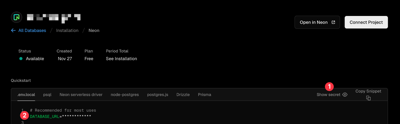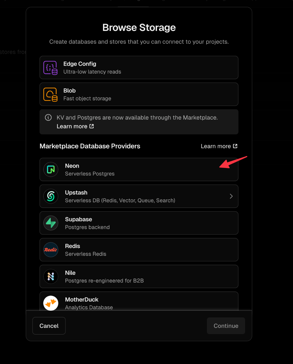 Vercelのダッシュボードから「Storage」→「Create Database」→「Postgres」を選択してデータベースを作成します。