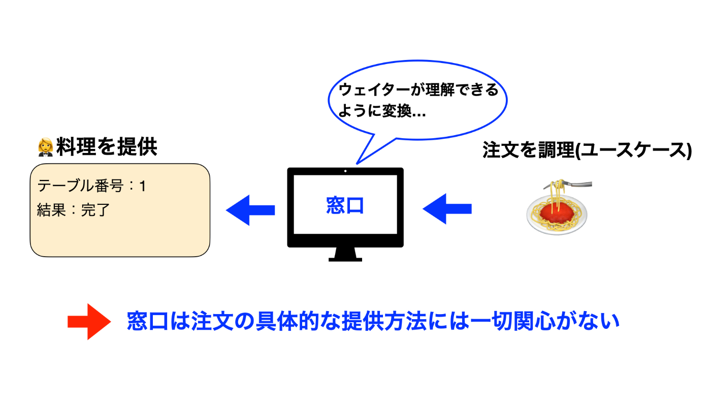 窓口の担当者は、カルボナーラの 作り方(ビジネスロジック)は一切知りません。 ただ、適切な担当に仕事を依頼するだけです。