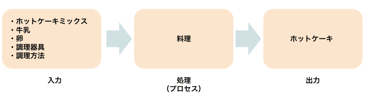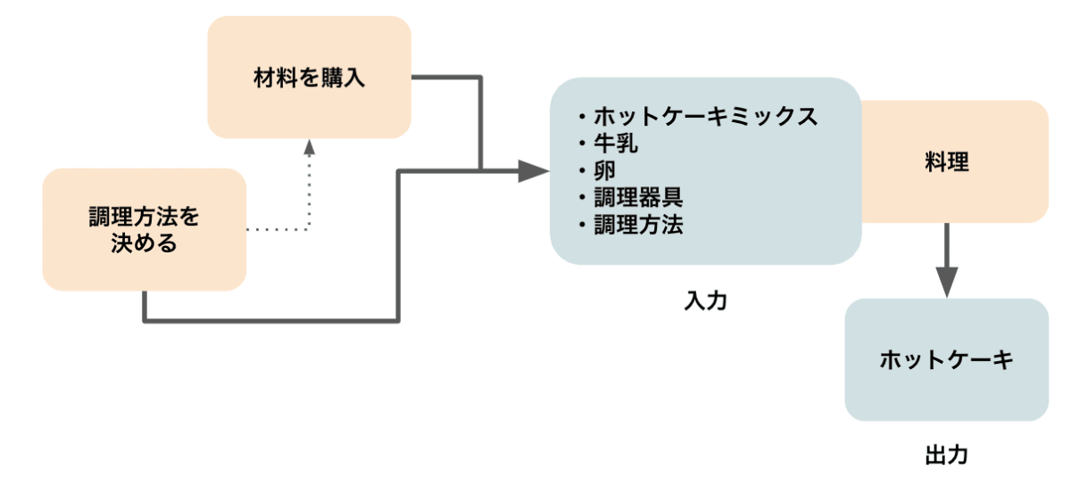 この図のように、ホットケーキを作る場合には入力であるいくつかの要素が必要となります。