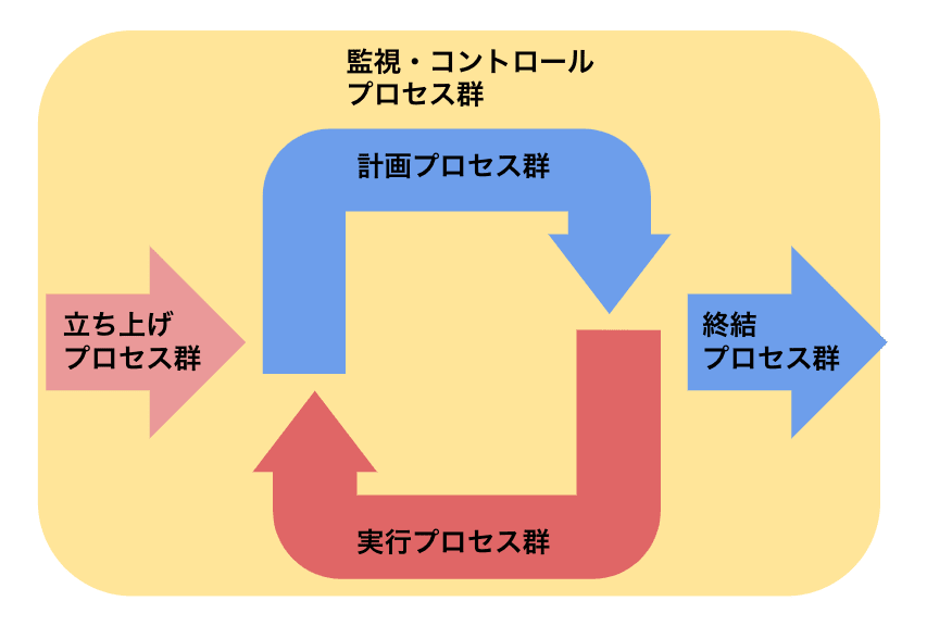 PMBOKでは5個定義されており、各プロセスが必ずどれかには所属している。
