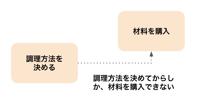 また、調理方法が決まらないと材料を買ってこれないため、この2つの処理には依存関係が生まれます。