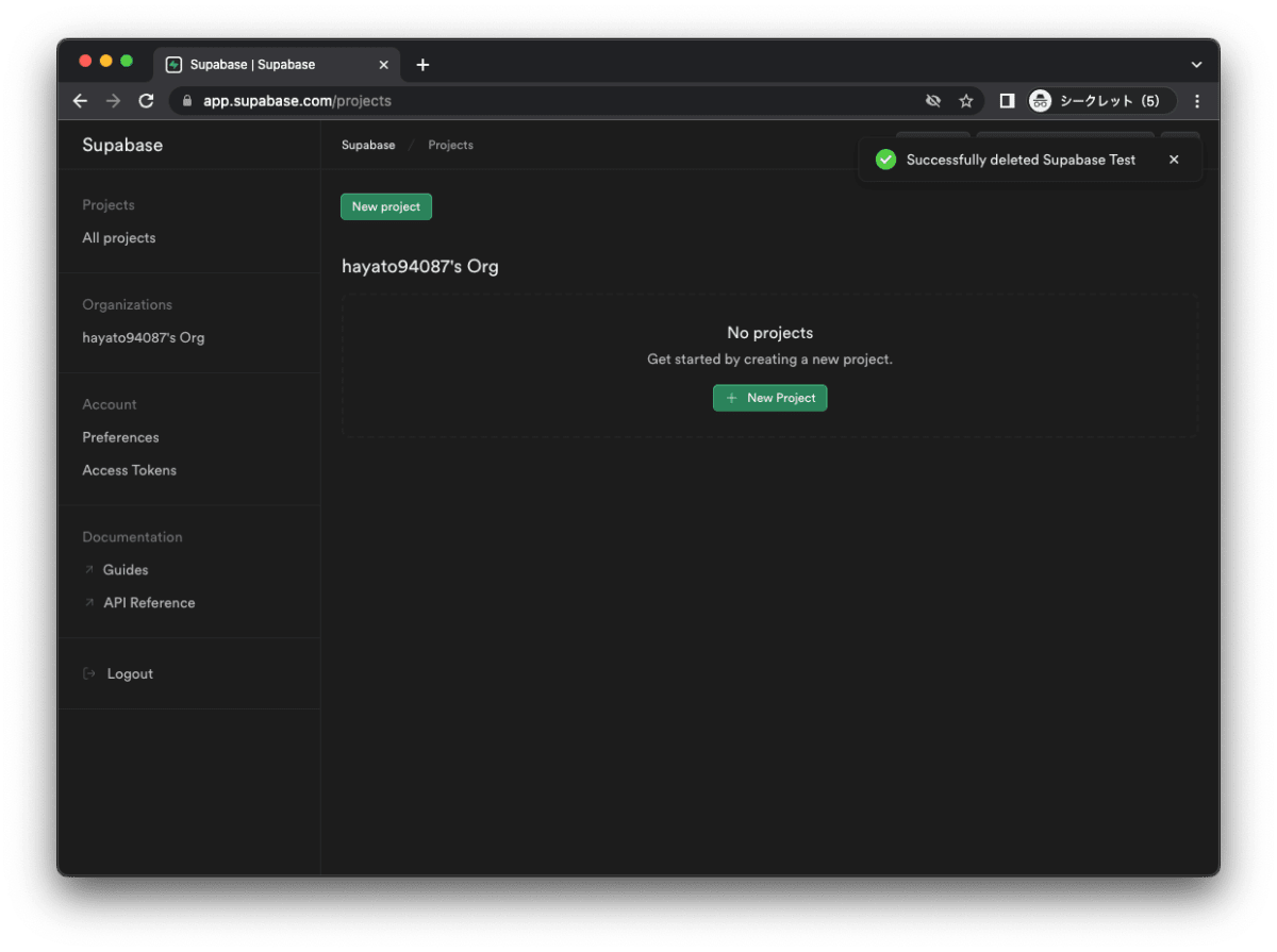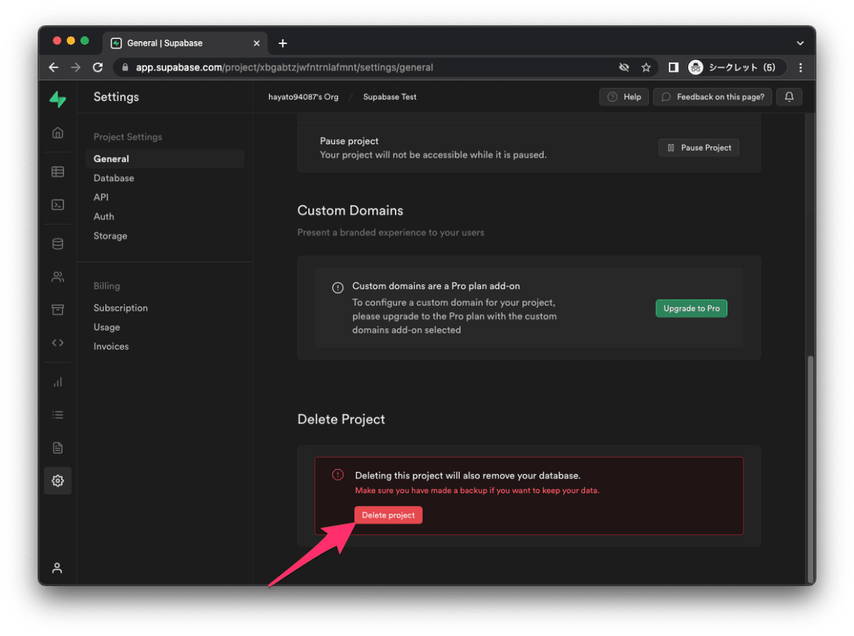 以下の手順で、Supabase のプロジェクトを削除します。