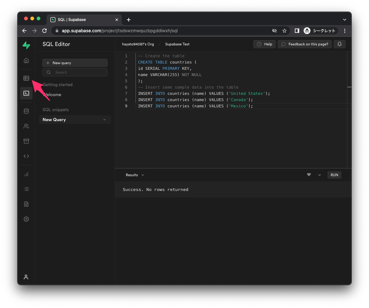 以下に沿って Supabase のプロジェクトを作成していきます。TypeScript で動作させるためにところどころコードは修正します。